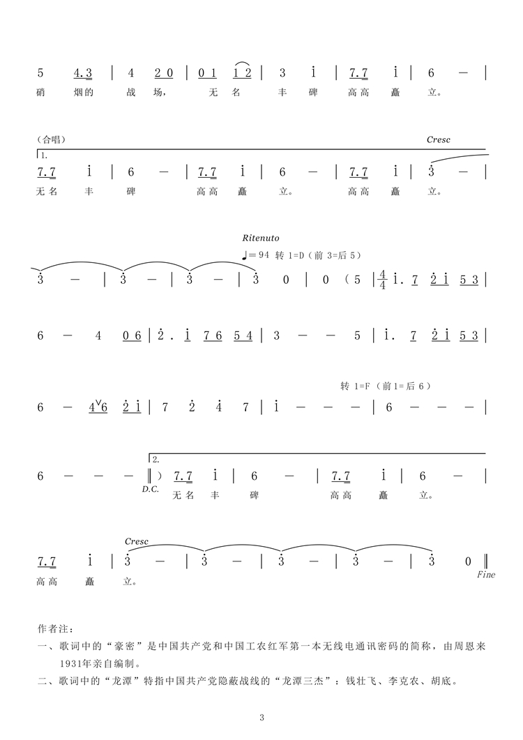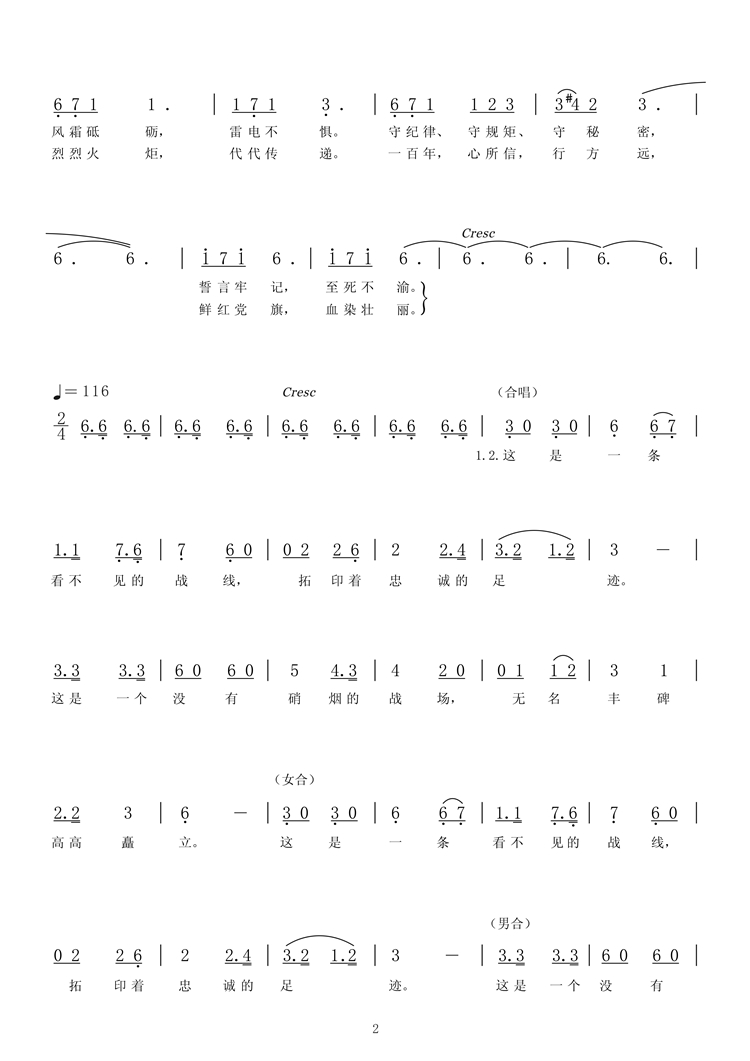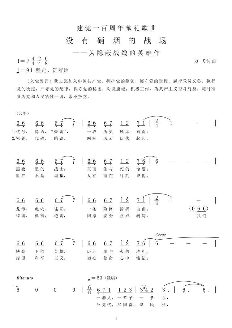 慶祝建黨百年獲獎歌曲作品選集——《沒有硝煙的戰(zhàn)場》歌詞。 建黨一百周年獻禮歌曲 沒 有 硝 煙 的 戰(zhàn) 場 ——為 隱 蔽 戰(zhàn) 線 的 英 雄 作 (入黨誓詞)我志愿加入中國共產黨,擁護黨的綱領,遵守黨的章程,履行黨員義務,執(zhí)行黨的決定,嚴守黨的紀律,保守黨的秘密,對黨忠誠,積極工作,為共產主義奮斗終身,隨時準備為黨和人民犧牲一切,永不叛黨。 (A1 段) 代號、隱語、“豪密” 一段歷史風風雨雨 黑夜里的戰(zhàn)士 直面生與死的命題 (A2 段) 龍?zhí)、虎穴、諜?/p> 一條險路折折曲曲 鐵幕下的英雄 歷經血與火的洗禮 (A3 段) 密鑰、代碼、暗語 網際風云伏伏起起 世界不是虛擬 人在密在時刻警惕 (A4 段) 秘密、機密、絕密 國家安全點點滴滴 我們捍衛(wèi)和平正義 初心使命心中銘記 (B1 段) 一群人、一輩子、一條心 風霜砥礪,雷電不懼 守紀律、守規(guī)矩、守秘密 誓言牢記,至死不渝 (B2 段) 分黨憂、盡國責、謀民利 烈烈火炬,代代傳遞 一百年,心所信,行方遠 鮮紅黨旗,血染壯麗 (C 段) 這是一條看不見的戰(zhàn)線 拓印著忠誠的足跡 這是一個沒有硝煙的戰(zhàn)場 無名豐碑高高矗立 這是一條看不見的戰(zhàn)線 拓印著忠誠的足跡 這是一個沒有硝煙的戰(zhàn)場 無名豐碑高高矗立 無名豐碑高高矗立 高高矗立 作 者:萬 飛 初稿于2021年2月24日 子夜 二稿于2021年3月8日 子夜 作者注: 一、A1段歌詞中的“豪密”是中國共產黨和中國工農紅軍第一本無線電通訊密碼的簡稱,由周恩來1931年親自編制。 二、A2段歌詞中的“龍?zhí)丁碧刂钢袊伯a黨隱蔽戰(zhàn)線的“龍?zhí)度堋保哄X壯飛、李克農、胡底。 三、歌曲演唱順序: 前奏(入黨誓詞念白)—A1段—A2段—B1段—C段—重復C段 間奏(入黨誓詞念白)—A3段—A4段—B2段—C段—重復C段 編輯:高思佳相關推薦: