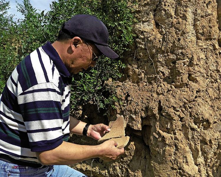 白描查看涇陽(yáng)鄭國(guó)渠遺跡土層中的秦橫紋瓦 李勝靈/攝