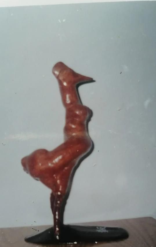 那是1988年秋的一天,在上班路上,老李見一棗樹殘軀,只有一支細(xì)根連在崖上,在風(fēng)中搖擺,驀然發(fā)現(xiàn)其竟像一個人形,就上前將其拽下,帶回單位。經(jīng)過簡單處理,就有點像一個古代武將似在張臂開弓,霸氣十足。這是老李創(chuàng)作的第一幅根雕作品。從此,老李一發(fā)不可收,開始尋根獵奇,多了對庫渠塄畔、地頭崖邊殘木枯根的留意,將稍有特色形狀的帶回,利用其自然形態(tài),加想象構(gòu)思,以形取勢,以勢寓意,以意傳情,稍作取舍,使其重生。