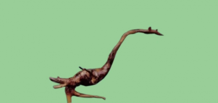 有一棵小樹在水庫邊倒吊著,枝桿浸在水里,樹皮大都腐朽脫落了,只有一條細(xì)根還連在岸邊的石縫里,看上去像只飄浮在水里的鳥兒。老李把它從水里撈出來,從石縫中輕輕拽下來,發(fā)現(xiàn)它長著長長的脖頸,有點像只天鵝;丶液蟀阉旁谌缢谋烫荷,讓它圓了紅掌撥清波的夢。名曰《紅掌清波》。詩云:若非經(jīng)雨雪;怎可變天鵝。