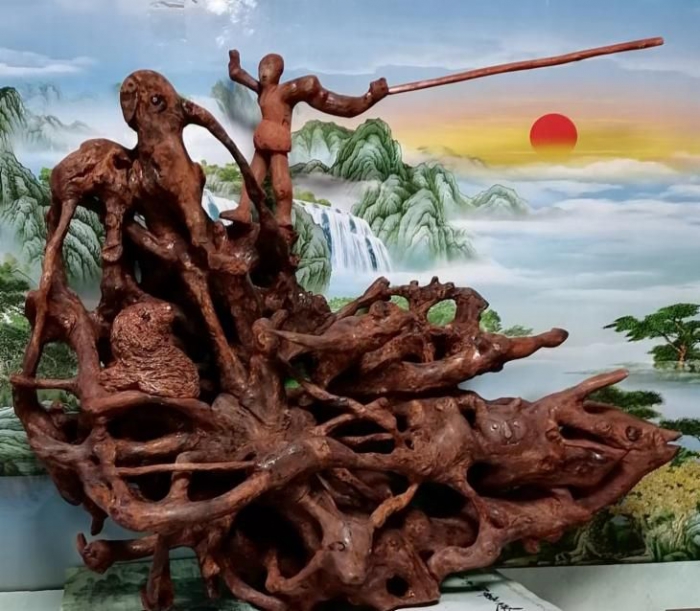 這是一塊被扔在垃圾場的柿樹根,有很長時間了,經(jīng)雨淋日曬,根皮脫落,泥土涮掉,露出根曲如龍,坦露出稀奇古怪的原形。老李看它很有可雕的潛質(zhì),就用三輪車?yán)卦豪,掏泥沙,除根皮,吹風(fēng)晾曬。經(jīng)過半年觀察思考,老李從它具有的鷹獅虎牛象的雛形和盤根如網(wǎng)的外觀上,突然想到了《西游記》中大戰(zhàn)獅駝嶺撞破盤絲洞及戲牛斗虎的故事,就把它們雕刻了出來。老李又找來一塊獼猴桃根,雕成揮舞的金箍棒,按在立于上端的悟空手中,就有了西游記故事的畫面:青絲白象是文殊普薩的坐椅,大鵬金翅雕刻后就成了如來的護(hù)法,讓悟空來打敗這些仗著背后有人而胡作非為的妖魔精怪,還一個太平安康的人間。就給這件作品起了個《澄清玉宇》的名字。這時,老李想起偉人毛澤東的一首詩,作為這副根雕的注解:金猴奮起千均棒,玉宇澄清萬里矣。今日歡呼孫大圣,只緣妖霧又重來。