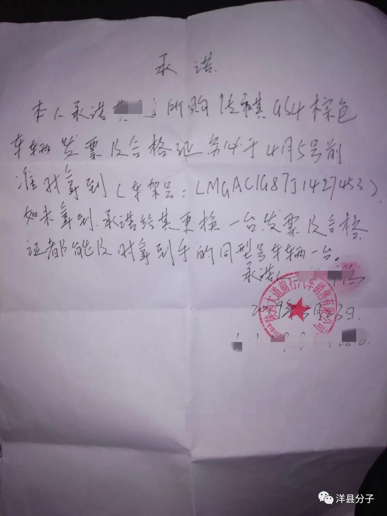 “多次催促之后,車店老板還給我寫了保證書,承諾4月5日之前將合格證給我,但后來還是未兌現(xiàn)。”黃先生說,更讓他始料未及的是,車店在4月16日之后就關(guān)門了。 隨后,黃先生聯(lián)系了廣汽傳祺客服,客服稱洋縣大道前行名車店未將車款打過去,因此沒有給合格證。他說,該車店現(xiàn)在已人去樓空,多次聯(lián)系車店法人苗某梅及合伙人白某,均無法聯(lián)系上!懊绲碾娫捴苯訒和7⻊(wù),白的電話能打通,但人家一直不接。”