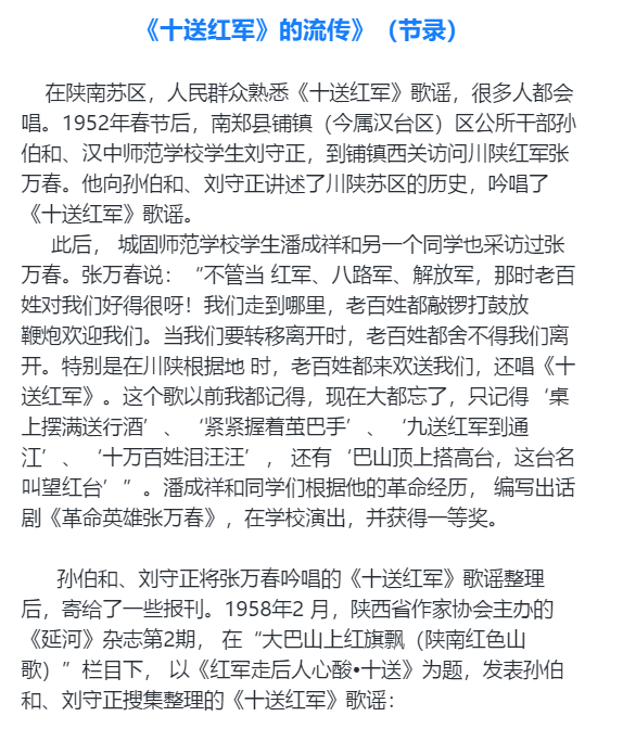 劉志青教授是漢中南鄭人,現(xiàn)在是中國(guó)人民解放軍軍事科學(xué)院研究員、研究生導(dǎo)師。多年來(lái),他潛心研究中外軍事歷史和我國(guó)紅色文化,走訪(fǎng)各地,考察史跡,四處講學(xué),出版專(zhuān)著。 劉志青教授對(duì)漢中的紅色文化格外關(guān)注。今年走訪(fǎng)了南鄭、鎮(zhèn)巴等革命根據(jù)地,對(duì)陜南紅色交通線(xiàn)、巴山游擊隊(duì)革命斗爭(zhēng)歷史做了細(xì)致了解,帶領(lǐng)中央電視臺(tái)專(zhuān)題組到漢中市南鄭、鎮(zhèn)巴等區(qū)縣采訪(fǎng)錄制專(zhuān)題片。同時(shí),他查閱了大量上世紀(jì)五、六十年代的報(bào)刊資料,對(duì)紅色歌謠《十送紅軍》的收集整理發(fā)表過(guò)程和首創(chuàng)作者及作品流傳等情況根由做了深入挖掘和梳理。其結(jié)論是《十送紅軍》歌詞是陜南歌謠,最早收集整理發(fā)表這首歌謠的人是漢中的孫伯和先生等。孫伯和從上世紀(jì)五十年代就開(kāi)始搜集整理陜南革命歌謠,后稱(chēng)“紅色歌謠”。上世紀(jì)50、60年代孫伯和先生在報(bào)刊上發(fā)表了幾百首紅色歌謠,確立了孫伯和是陜南紅色歌謠的最早收集者、整理者、發(fā)表者、傳播者的地位。 劉志青教授在2019年第8期《炎黃春秋》期刊上發(fā)表長(zhǎng)篇報(bào)道文章《陜南歌謠《十送紅軍》的流傳》,對(duì)《十送紅軍》歌謠的出現(xiàn)過(guò)程就流傳情況作了全面介紹,廓清了《十送紅軍》歌謠的有關(guān)疑難問(wèn)題。下邊節(jié)錄幾段請(qǐng)大家閱讀研究。