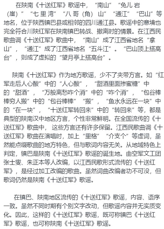 一送紅軍下南山,秋風(fēng)細(xì)雨纏綿綿, 山里野鹿哀號(hào)叫,樹(shù)樹(shù)梧桐葉落完, 紅軍啊!幾時(shí)人馬再回山? 二送紅軍大道旁,紅漆木桌路邊放, 桌上擺滿(mǎn)送行酒,酒兒里邊摻蜜糖, 紅軍。《髑樗坪2荒芡! 三送紅軍上大道,鑼兒無(wú)聲鼓不敲, 雙雙拉著長(zhǎng)繭手,心象黃連臉在笑。 紅軍!萬(wàn)般離愁怎能消? 四送紅軍過(guò)高山,山上包谷金燦燦, 包谷種籽紅軍種,包谷棒棒窮人搬, 紅軍啊,撒下種籽紅了天! 五送紅軍上了坡,鴻雁陣陣空中過(guò), 鴻雁能捎書(shū)和信,飛到天涯和海角, 紅軍。∩有哦喟选案锩闭f(shuō)! 六送紅軍兔兒巖, 兩只白兔哭哀哀; 禽獸也能通人性,血肉感情拋不開(kāi)。 紅軍。 山里的紅花永不! 七送紅軍七里灣,灣灣上下一片田, 田里谷穗頭彎下,田里鯉魚(yú)翻田坎, 紅軍! 新米上市人去遠(yuǎn)! 八送紅軍八哥山,兩只八哥吐人言, “紅軍哥哥莫遠(yuǎn)走,走遠(yuǎn)了財(cái)東要倒算!” 紅軍啊!窮人的苦水吐不完! 九送紅軍到“通江”,通江河上船兒忙, 千軍萬(wàn)馬河畔站,十萬(wàn)百姓淚汪汪。 紅軍! 眼望江水?dāng)喔文c! 十送紅軍轉(zhuǎn)回來(lái),巴山頂上搭高臺(tái), 臺(tái)高十丈白玉柱,雕龍繡鳳放光彩。 紅軍! 這臺(tái)名叫“望紅臺(tái)”! 1958年4月,《延河》雜志第4期發(fā)表魏鋼焰《“陜南紅色山歌”頌》一文,高度評(píng)價(jià)了該歌謠。6月,上海文化出版社出版《現(xiàn)代民間文學(xué)叢書(shū)•革命歌謠選》,以《紅軍走后人心酸•十送歌》為題,收錄孫伯和、劉守正搜集整理的《十送紅軍》歌謠。1983年7月, 陜西省漢中地區(qū)群眾藝術(shù)館編、陜西人民出版社的《陜南革命歌謠選》,以《十送紅軍》為題,再次收錄了孫伯和、劉守正搜集整理的這首歌謠。