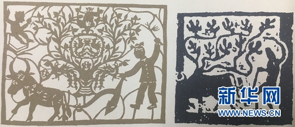左圖是陜北安塞白鳳蘭剪紙《牛耕圖》,右圖是陜北漢畫像石《牛耕圖》,兩者造型極為相像。 在楊先讓看來,傳統(tǒng)民間藝術(shù)是中國藝術(shù)的本源,宮廷、文人藝術(shù)都是由它發(fā)展而成的,后來的剪紙、皮影、民瓷畫、木版畫又是以民間美術(shù)為主,吸收宮廷、文人藝術(shù)而派生的。 當年楊先讓第一次看到庫淑蘭的剪紙時,他傻了,大呼:“怎么會有這么精彩的剪紙!”