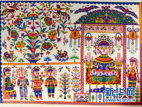 庫淑蘭剪紙《花轎》 “剪紙這種民間美術(shù)形式,是中國各民族的農(nóng)家婦女所熟悉的,歷史悠久,風(fēng)格豐富多樣。”楊先讓說,剪紙的應(yīng)用,首先是從婦女剪繡花樣子、保存繡花樣子開始的,然后派生出為生、婚、喪及節(jié)令民俗等各種活動制作的剪紙,如禮花、喜花、團花、頂棚花、炕圍花、窗花以及紙扎等品種!凹艏埵菋D女創(chuàng)造的母體藝術(shù)中的平面造型藝術(shù),是民間美術(shù)的基礎(chǔ)部分。要研究傳統(tǒng)民間美術(shù)的造型法則和哲理內(nèi)涵,從傳統(tǒng)的民間剪紙藝術(shù)中尋求將是一條快捷方式!