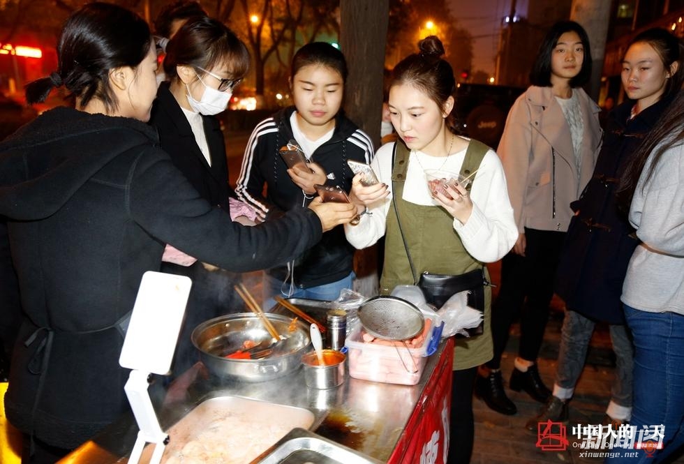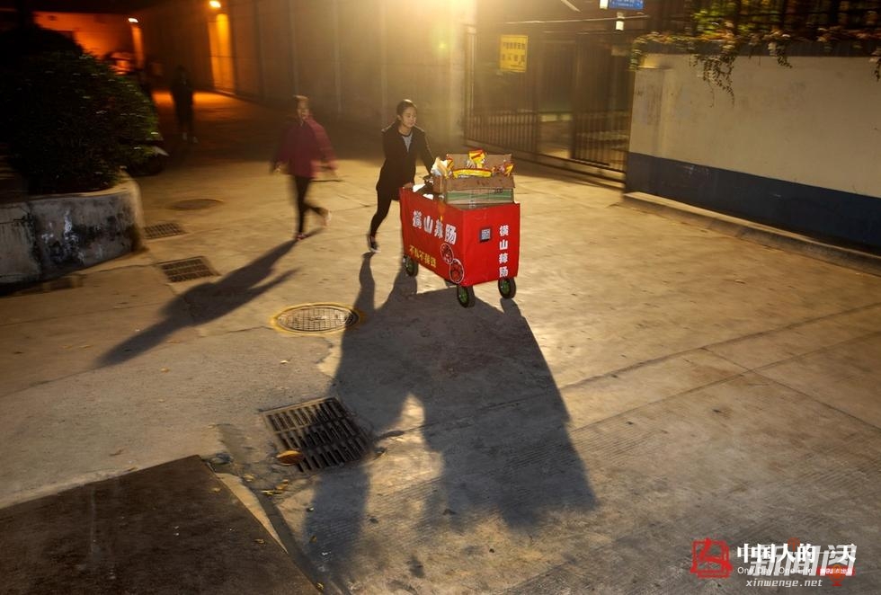 昏黃的路燈下,賈瑞霞推著寫(xiě)有“橫山辣腸”的推車(chē)快速穿行著。她找好位置快速地支好車(chē)子,這時(shí)買(mǎi)辣腸的人已經(jīng)排起了隊(duì)。