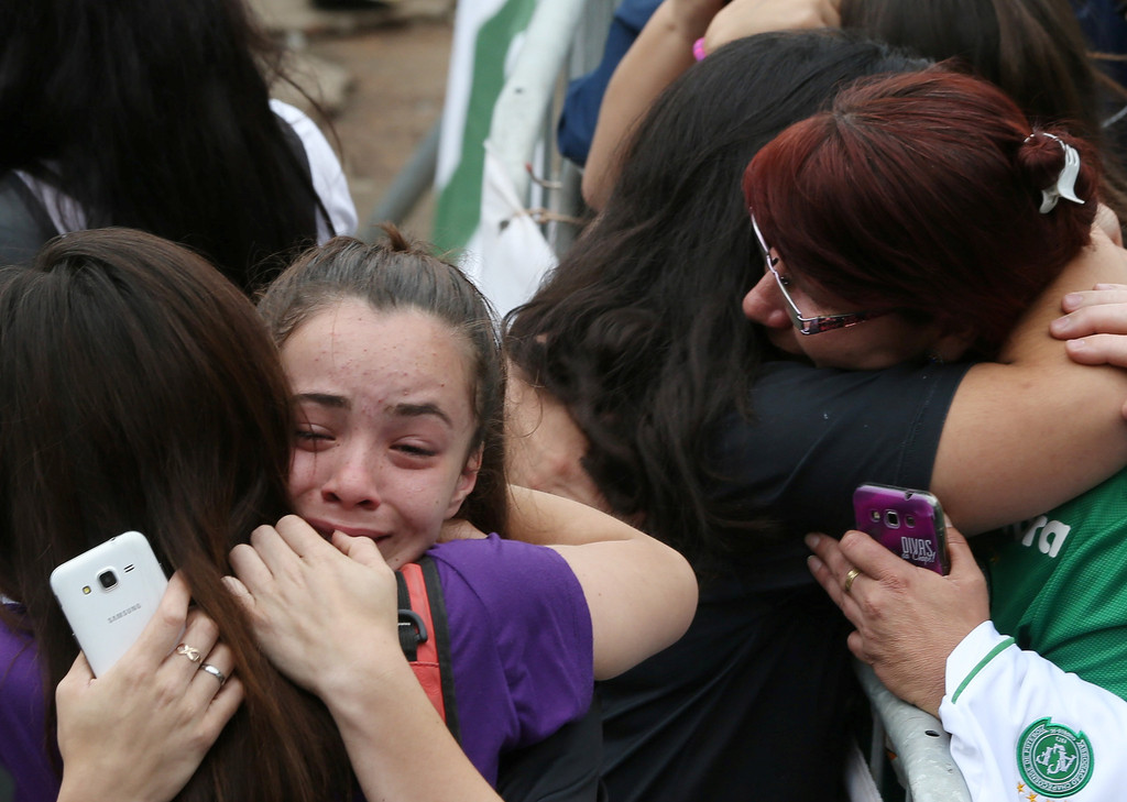 巴甲球隊(duì)遭遇空難 大批球迷集結(jié)俱樂部球場(chǎng)相擁痛哭2016年11月29日,巴西,巴甲沙佩科恩斯隊(duì)遭遇空難,大批球迷集結(jié)俱樂部球場(chǎng)相擁痛哭。