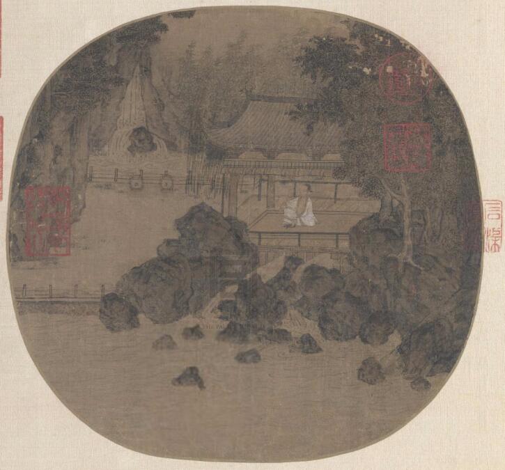 《納涼觀瀑圖》頁 宋 絹本設(shè)色 清溪一灣,溪畔水閣掩映在蓊郁的翠樹秀竹之中,背景峭壁堅崚,飛瀑如練,溪流急湍擊石,清波拂岸,充滿著夏日大自然的勃勃生機(jī)。水閣之中一高士白衣袒胸踞席而坐,凝視潺湲,若有所思,頗有“坐看云起時”之態(tài)。