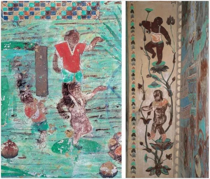 (左圖)莫高窟220窟 南壁 初唐 (右圖)莫高窟329窟 西壁佛龕 初唐 紅白相間的條紋背帶褲讓這位踩在荷葉上舞蹈的美男子在夏季穿搭中脫穎而出,不過他似乎并未勝過后面那位以紅配綠大膽出位的人士。這些壁畫準(zhǔn)確的記錄了初唐的潮流舞臺上,人們爭相秀出自己的模樣。“我要成為全小區(qū)/全校/全公司最時髦的那一個”,他們當(dāng)時也許擁有著同樣的心情。右圖同樣來自敦煌莫高窟(329窟),其中那雙橘黃色的襪子也很值得品味一番。