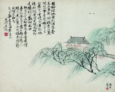 楊柳樓臺(tái)圖(國(guó)畫) 吳轂祥 吳昌碩題 一長(zhǎng)廊延伸至湖中,湖心處一樓閣,兩高士倚欄而坐,清談賞景。數(shù)株楊柳從岸邊斜出,垂下萬條絲絳。湖面霧靄沉沉,一望無際。這是畫家吳轂祥(1848-1903)筆下的一幅山水小品所呈現(xiàn)的景象。在畫幅右下側(cè),吳轂祥自署“轂祥制”,鈐白文方印“吳轂祥”。在畫幅左上側(cè),則有吳昌碩(1844-1927)題跋云:“楊柳綠沈黃歇浦,樓臺(tái)高并筑耶城。彼蒼位置閑如此,坐看寒潮六月生。小倉山下古隨園,景物依稀到眼前。殘?jiān)聲燥L(fēng)呼即是,填詞不數(shù)柳屯田。翔父先生以《楊柳樓臺(tái)圖》索繪,蓋不知余盲于畫也,辭不獲,已轉(zhuǎn)乞吳秋農(nóng)老友設(shè)色成此,題句補(bǔ)空,即乞是正,己丑長(zhǎng)夏同客滬上,昌碩吳俊。”鈐白文方印“吳昌石宜壽”。據(jù)此可知,此圖實(shí)為“翔父先生”請(qǐng)吳昌碩繪,而吳昌碩自稱“盲于畫也”,故由其好友吳轂祥代勞!凹撼蟆睘榍骞饩w十五年(1889年),時(shí)年吳昌碩四十六歲。吳昌碩早年以詩文、書法、篆刻馳名,拙于繪事。在清光緒十四年(1888年),吳昌碩師從任伯年學(xué)畫,其時(shí)以梅竹為專長(zhǎng),F(xiàn)在所見吳昌碩這一時(shí)期的繪畫中,有清光緒十二年(1886年)的《墨梅圖》和《墨荷圖》(均藏浙江省博物館)、十三年(1887年)的《綠梅圖》及十五年(1889年)的《瓶荷圖》(均藏中國(guó)美術(shù)館)等,唯獨(dú)不見山水。故此時(shí),吳昌碩不是“盲于畫”,而是對(duì)《楊柳樓臺(tái)圖》這類的山水畫不能嫻熟駕馭,故有請(qǐng)人代筆之舉。此外,吳昌碩此詩并不見于其梓行的詩集中,因而乃其軼詩,可補(bǔ)文獻(xiàn)之不足。 吳昌碩跋語中所言“翔父先生”,為袁祖志(1827-1899),乃清代文學(xué)家袁枚(1716-1798)嫡孫。他字翔甫,一作翔父、祥甫,號(hào)倉山舊主、又齋,別署楊柳樓臺(tái)主人,浙江錢塘(今杭州)人,曾官同知,于清光緒九年(1883年)隨唐廷樞(1832-1892)訪問歐洲,后寓居上海,歷任《新聞報(bào)》《申報(bào)》和《新報(bào)》主筆,著有《談瀛錄》《隨園瑣記》等。 清光緒七年(1881年),袁祖志在位于上海城北的四馬路筑楊柳樓臺(tái),一時(shí)詩壇名流紛紛吟詩作賦,極壇坫之盛。袁祖志自己有《自題楊柳樓臺(tái)圖請(qǐng)同社諸君子暨大吟壇正之》詩記其事: 要把繁華俗轉(zhuǎn)移,大張旗鼓日吟詩。春歸楊柳千條盡,人在樓臺(tái)四顧宜。十里笙歌花簇簇,六街燈火漏遲遲。貧來百事從人借,借得園林景更奇。買鄰偏近可兒家,柳色深藏幕不遮。但有才人皆入座,斷無騷客不停車。拓開幾案爭(zhēng)評(píng)畫,倚遍欄桿為賞花。盡把風(fēng)光共消遣,勝他俗吏唱排街。偶然平地學(xué)神仙,勝友良朋盡有緣。百首新詩題壁上,一樽清酒醉花前。才看棋局爭(zhēng)雙刦,又聽琴聲動(dòng)七弦。也是浮生行樂處,何須十萬買山錢。綠陰濃覆盡沈沈,到此應(yīng)無俗慮侵。蝸角客盈疑廣廈,馬蹄聲碎出疏林。吹人衣袂風(fēng)常送,曠我襟懷月更臨。笑指三山森海上,穴濛蜃氣未須尋。 從詩中可知其興味之所在。而在樓臺(tái)建立當(dāng)年,好友龍湫舊隱(葛其龍)亦有《辛巳暮春倉山舊主得小樓于城北綠柳深處,顏其額曰“楊柳樓臺(tái)”,集同人觴詠其中,因成四律以志其勝》,其一曰:“倉山舊主最風(fēng)流,垂柳陰中作小樓。一片煙波翦淞水,二分明月借揚(yáng)州。閑情聊復(fù)調(diào)鸚鵡,近局還堪約鷺鷗。此日冶春重結(jié)社,要將佳話播千秋!贝丝蓮膫(cè)面窺探當(dāng)時(shí)楊柳樓臺(tái)的雅趣。據(jù)不完全統(tǒng)計(jì),在袁祖志主筆的《申報(bào)》上,以“楊柳樓臺(tái)”為主題與其唱和的詩篇有數(shù)十首之多,足見其在晚清上海文壇的影響力。 不僅如此,袁祖志還邀請(qǐng)當(dāng)時(shí)滬上的繪畫名家,以“楊柳樓臺(tái)圖”為主題,揮灑丹青,留下圖像記錄,上述吳轂祥作品即是一例。在此之外,為其繪制斯圖且作品可見者還有俞禮、陸琪、倪茹、潘耕數(shù)家。 俞禮所畫為三株柳樹迎風(fēng)吹拂,柳堤右下側(cè)露出樓臺(tái)一角,一高士趺坐其中,數(shù)卷詩書陳列其側(cè)。作者題識(shí)曰:“楊柳樓臺(tái)圖,翔甫老伯大人囑畫并請(qǐng)大雅兩正,俞禮!扁j白文方印“俞達(dá)夫”。俞禮(1862-1922),字達(dá)夫,號(hào)隨庵,浙江山陰(今紹興)人,任伯年弟子,擅畫山水、人物和花鳥,在上海以鬻畫為生。陸琪所寫為一座樓臺(tái)矗立在山麓下,遠(yuǎn)處山峰對(duì)峙,一人坐于閣樓中,眺望遠(yuǎn)景。作者題識(shí)曰:“楊柳樓臺(tái)圖,倉山舊主屬,陸琪!扁j朱文方印“琪”和“韻樵手筆”。陸琪,字云樵,一作韻樵,浙江蕭山人,擅畫山水、人物。倪茹所繪為一座閣樓屹立于湖邊,隱約可見一人之背影,近處為綠樹掩映,遠(yuǎn)處則水天一色,一望無垠。作者題識(shí)曰:“楊柳樓臺(tái)圖,翔甫姑丈大人命繪,乙未冬日姪輩倪茹謹(jǐn)寫!扁j朱文方印“儒粟”。倪茹,字儒粟,浙江杭州人,曾為諸生,自稱乃俞樾(1821-1907)弟子,擅詩文書畫。“乙未”為清光緒二十一年(1895年)。倪茹言袁祖志為姑丈,則兩人有姻親關(guān)系。潘耕所繪為一條河流的兩岸,楊柳依依,一座茅亭坐落于河西一側(cè),兩人對(duì)坐相談,亭邊水流潺潺。作者題識(shí)曰:“楊柳樓臺(tái)圖,戊子冬至日寫似倉山舊主,即請(qǐng)正之,稼梅潘耕!扁j白文方印“潘耕私