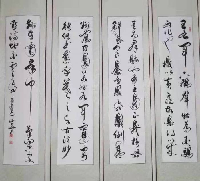 段曉華是用藝術(shù)形式完美表現(xiàn)其人生志向的書法家,人生的坎坷,生命的跌宕,都在他的一撇一捺間。他以草書成名,以臨摹蔣玉書先生十八鵝見長(zhǎng),字的結(jié)構(gòu)與筆法,具有強(qiáng)烈的個(gè)人特征。年輕時(shí)作品用筆尖銳、心懷激蕩,二十年軍旅烈火后,作品卻平靜如水、筆墨流暢,不再計(jì)較中鋒行筆,圓方并行,但卻獨(dú)具匠心、滿紙禪意,凝聚簡(jiǎn)約間展現(xiàn)出他書法作品高尚空靈的獨(dú)特魅力。