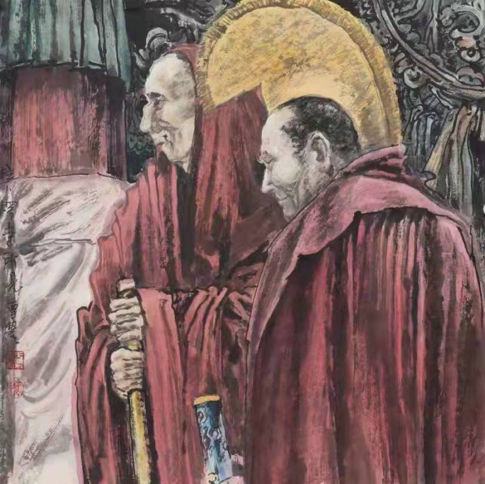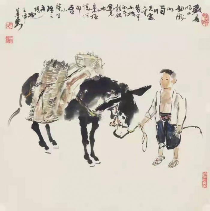 十七歲負笈長安,師從劉文西、陳志忠等泰斗,九年科班,八十有二,農(nóng)民、木匠、教師顛簸流離三十載,人生諸多角色在社會這所生猛大學里非他所愿、猝不及防的“變臉”著,也正是這極盡人間之能事的心酸與無奈,累到骨子里的悲憤,成就了他蒼渾樸重、辛辣澀深的作品特征。在他的反映藏民僧俗的盈丈巨幅里,還是在他無意揮就的尺牘小品里,無不迸發(fā)著冰山之后的平和和沉靜。他的山水、人物、花鳥,還有他那清俊秀逸、含蓄內(nèi)斂的書法,都詮釋著他對深沉世界的獨特理解。