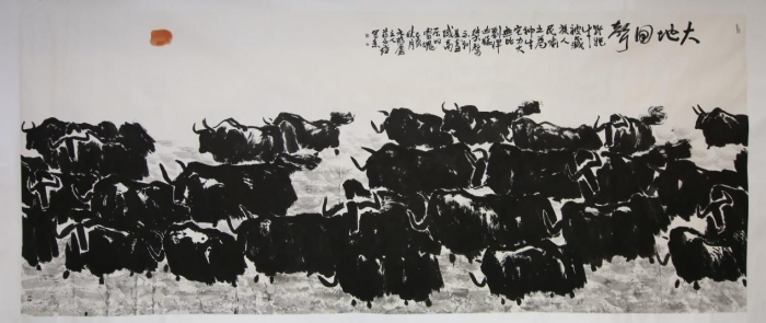 蔣志鑫《心隨天籟》(丈二) 抽象符號(hào)已相對(duì)固定,如方形太陽(yáng),山形的牦牛,玄與素代表黑白等等;書(shū)法有《遊心太玄》《我行我素》《天地大美而不言》《筆墨無(wú)底線》等等。他說(shuō):“我去充電不是大張旗鼓拍幾張照片就回來(lái),而是悄悄地深入底層,獨(dú)與天地精神往來(lái),體味自然萬(wàn)物的精神內(nèi)涵,充實(shí)自己的精神境界。我的作品是我真情的流露和藝術(shù)的再造……以長(zhǎng)筆大墨書(shū)寫(xiě)我心中逸氣和自然風(fēng)骨!钡诙糠忠彩撬乃囆g(shù)主要部分,藝術(shù)已高度成熟,也是轟動(dòng)中西藝術(shù)界的部分。當(dāng)然,蔣的書(shū)畫(huà),并不是白玉無(wú)瑕、盡善盡美。場(chǎng)面宏大,就多一些制作性;書(shū)法不能“致廣大而盡精微,極高明而道中庸”,少一些古代文人筆墨的講究,畫(huà)一些傳統(tǒng)的題材,不能做到盡顯功力等等,這些都是今后應(yīng)當(dāng)引起注意的。
