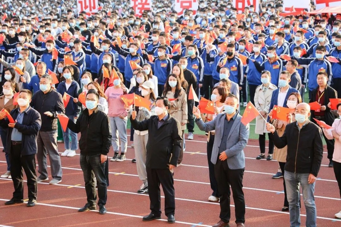 7時(shí)20分,國(guó)旗護(hù)衛(wèi)隊(duì)迎著朝陽踏著矯健的步伐,莊嚴(yán)地護(hù)衛(wèi)著五星紅旗走至升旗臺(tái)前,同時(shí),另一面巨型國(guó)旗也在人群的上方中央緩緩展開,兩側(cè)“喜迎黨的二十大,匠心筑夢(mèng)新征程”巨型標(biāo)語耀眼醒目。全體師生莊嚴(yán)肅穆,集體行注目禮,向著莊嚴(yán)的國(guó)旗表達(dá)著最崇高的敬意。隨后雄壯有力的《國(guó)歌》響徹校園,冉冉升起的五星紅旗點(diǎn)燃了全體師生的愛國(guó)熱情,激發(fā)了同學(xué)們奮勇前行的昂揚(yáng)斗志。