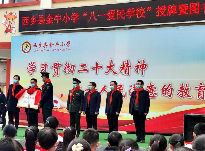縣委常委、副縣長陳亮在講話中強(qiáng)調(diào),金牛小學(xué)是我縣首所被教育部、中央軍委政治工作部、全國雙擁工作領(lǐng)導(dǎo)小組辦公室共同授予“八一愛民學(xué)!狈Q號(hào)的榮譽(yù)單位。要以此次授牌為契機(jī),繼承和發(fā)揚(yáng)人民軍隊(duì)的優(yōu)良傳統(tǒng),充分挖掘利用好西鄉(xiāng)本地紅色資源,傳承好紅色基因,傳播好紅色文化,賡續(xù)精神血脈,牢記使命,星火相傳,奮力開創(chuàng)西鄉(xiāng)教育事業(yè)新篇章。 儀式現(xiàn)場,縣退役軍人事務(wù)局還向金牛小學(xué)捐贈(zèng)了圖書。