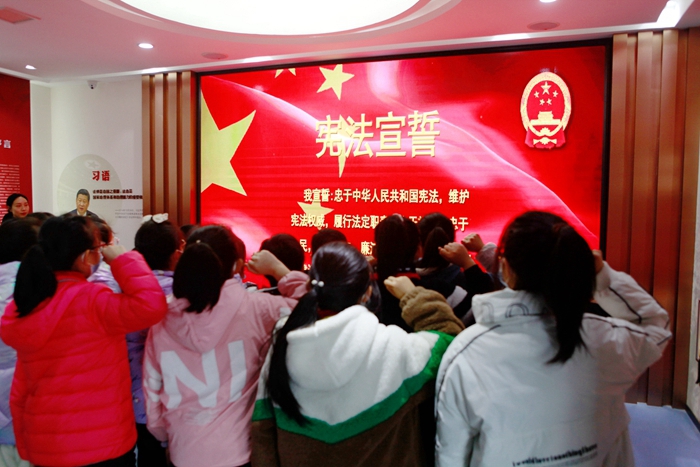 參觀過程中,同學(xué)們跟隨講解員的腳步,參觀了基地的圖文展板,聆聽了真實(shí)案例,觀看了未成年人法治教育微電影《鼎故承新,茶鄉(xiāng)筑夢(mèng)》。同時(shí),在優(yōu)秀少先隊(duì)員喬漢誠的帶領(lǐng)下莊嚴(yán)宣誓:自覺遵守法律法規(guī),知法、守法、懂法、用法,自立自強(qiáng),爭(zhēng)做熱愛祖國、理想遠(yuǎn)大的新時(shí)代好少年!講解員說:少年強(qiáng),則國強(qiáng),希望同學(xué)們能夠從小樹立法治意識(shí),培養(yǎng)法治觀念,認(rèn)真學(xué)習(xí)法律,學(xué)會(huì)用法律知識(shí)保護(hù)自己,幫助別人。 同學(xué)們表示,此次參觀學(xué)習(xí)了解了更多關(guān)于未成年人的法律知識(shí),感受到了法律的魅力,以后要做一個(gè)學(xué)法、用法、守法的好公民。