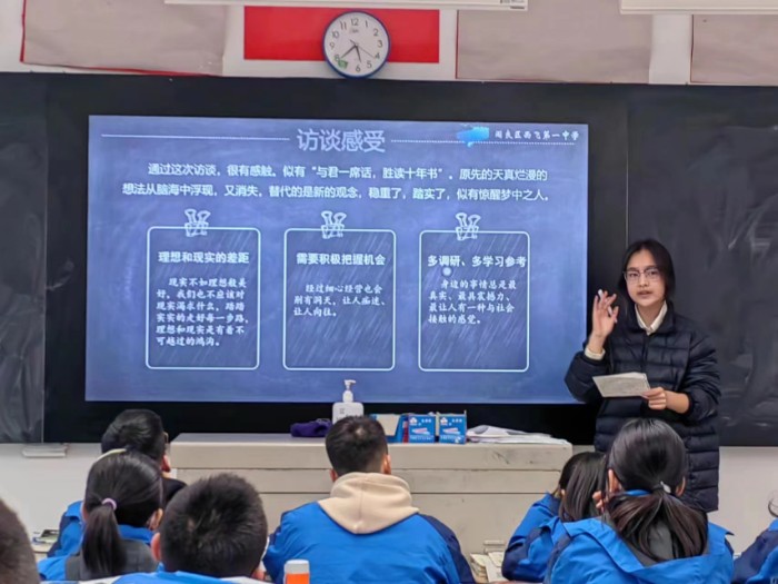 西飛一中“職業(yè)生涯人物訪談”假期實(shí)踐活動圓滿結(jié)束文化藝術(shù)網(wǎng)-文化藝術(shù)報訊(全媒體記者 宋光)“這次的訪談讓我了解到每一個平凡的崗位都需要付出艱辛的努力,而當(dāng)下作為新時代青年的我們也應(yīng)該鞏固自己的基礎(chǔ)知識為之后步入職場做準(zhǔn)備,以便為祖國添磚增瓦,實(shí)現(xiàn)祖國繁榮富強(qiáng)!痹谖靼彩虚惲紖^(qū)西飛一中高一(6)班的教室里,白雨佳同學(xué)正在“職業(yè)生涯人物訪談分享會”主題班會上,分享著自己寒假實(shí)踐活動的心得和感受。而在高一年級的其他班級里,同樣的主題班會正在進(jìn)行……
