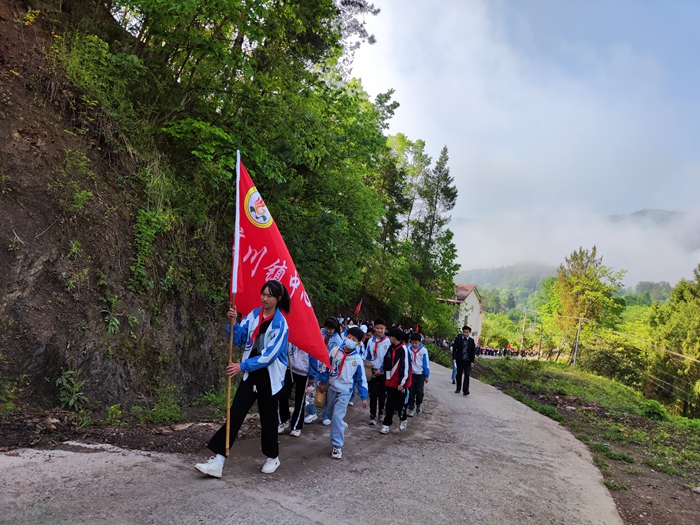 在校旗的帶領(lǐng)下,學(xué)生列隊(duì)前往勞動(dòng)實(shí)踐基地。一路上,山間自由奔騰的的小溪、路邊櫻桃樹上紅紅的櫻桃、草地上悠閑吃草的羊群、山間沒有消散的薄霧,無不引得同學(xué)們陣陣驚呼。同學(xué)們唱歌、背誦,表達(dá)快樂、愉悅的心情。