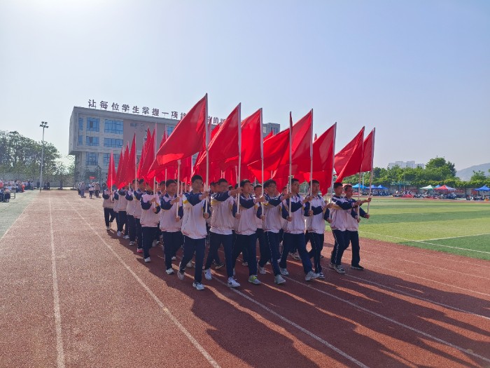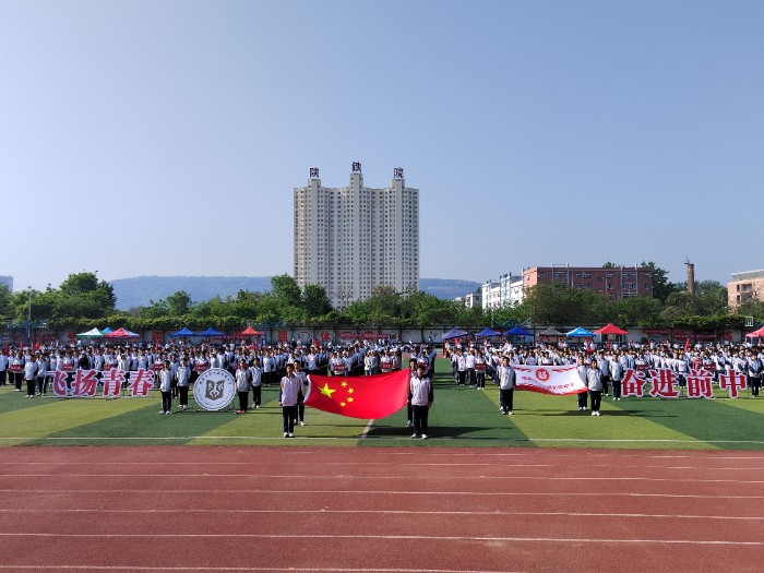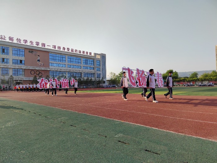 春風(fēng)浩蕩,陽光和煦。綠茵場上,“飛揚(yáng)青春 奮進(jìn)前中”八個(gè)大字在陽光下熠熠生輝,格外醒目。伴著歡快激昂的運(yùn)動(dòng)員進(jìn)行曲,十二名運(yùn)動(dòng)員簇?fù)碇r紅的國旗、絢麗的校旗以及象征“責(zé)任·愛·榮譽(yù)”校園精神的;瞻菏组煵浇(jīng)過主席臺(tái)。緊隨其后,激情飛揚(yáng)的運(yùn)動(dòng)主題方陣、絢麗多彩的花束方陣、精神抖擻的紅旗方陣依次步入會(huì)場,他們青春洋溢,揮舞的花束鮮艷奪目;他們精神抖擻,高舉的紅旗迎風(fēng)飄揚(yáng);他們步伐矯健,洪亮的口號(hào)響徹校園。緊接著,裁判員、運(yùn)動(dòng)員代表隊(duì)依次入場,他們斗志昂揚(yáng)、樂觀自信,充分展現(xiàn)了團(tuán)結(jié)協(xié)作、頑強(qiáng)拼搏的精神風(fēng)貌。
