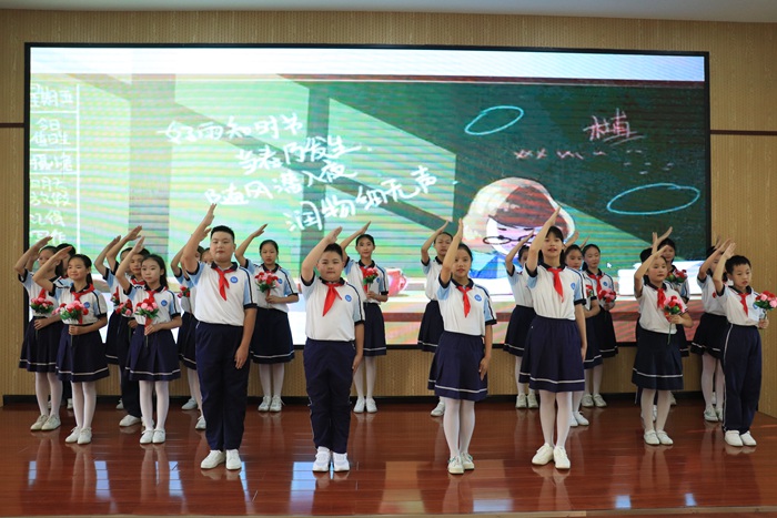 當(dāng)日下午,“躬耕教壇,強國有我”慶祝第三十九個教師節(jié)活動在學(xué)校多功能廳舉行,全體教師歡聚一堂,共慶節(jié)日。《高新區(qū)第四小學(xué)五年發(fā)展歷程》視頻,讓大家為學(xué)校五年來取得的輝煌成就由衷自豪,也被教師團隊敢于擔(dān)當(dāng)、勇于創(chuàng)新、團結(jié)協(xié)作、追求卓越的干事創(chuàng)業(yè)精神所鼓舞和激勵;六年級學(xué)生集體詩朗誦《老師,我們永遠(yuǎn)愛您》,向老師獻(xiàn)上深情的祝福。憶往昔環(huán)節(jié),通過觀看往年錄制的學(xué)!皯c七一”節(jié)目視頻,讓新老教師進一步堅定理想信念,重溫初心使命,傳承紅色精神,矢志砥礪前行;新加入四小團隊的大學(xué)生教師集體詩朗誦《我的北方,南方》將活動推向高潮。作品通過對南方北方的美景、博大精深文化的贊美,表達(dá)了對祖國大好河山的熱愛,對祖國豐富文化的贊頌,對家國振興充滿信心。