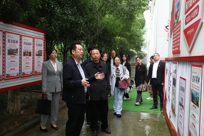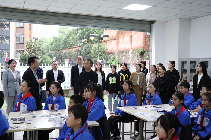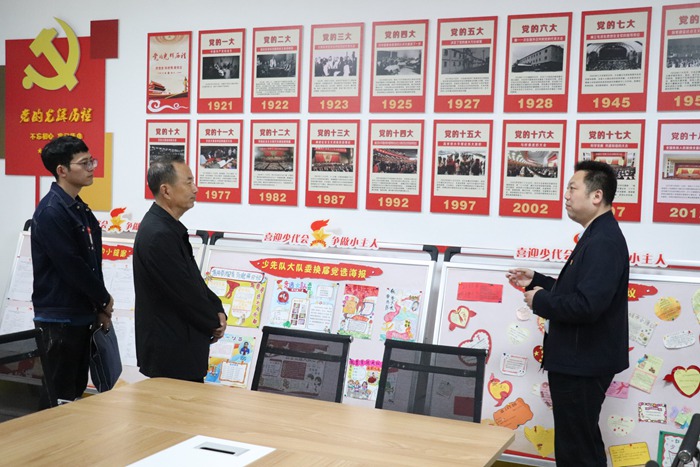 在高新四小,安康學(xué)院教授、陜南鄉(xiāng)村振興研究中心主任何家理,朱洪鵬博士,安康學(xué)院馬克思主義學(xué)院教工第二黨支部書記韓艷梅及馬院師生一行,隨著高新四小黨支部書記、校長張平德的講解,參觀校園榮譽(yù)墻、黨建展板、黨史文化墻、建黨精神廊道、版畫活動(dòng)室、少隊(duì)部。