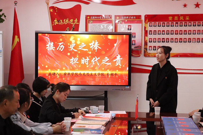 雙方在學(xué)校黨員活動(dòng)室進(jìn)行座談交流。在觀看四小深化“三個(gè)課堂”展示視頻后,張平德介紹高新四小的辦學(xué)理念、辦學(xué)特色和黨建工作成效,重點(diǎn)宣介以“四和文化”為核心的校園文化內(nèi)涵和推進(jìn)“三個(gè)課堂”建設(shè)的“5432”多維基礎(chǔ)教學(xué)管理模式。韓艷梅介紹安康學(xué)院馬克思主義學(xué)院教工第二黨支部基本情況,表示將以此為契機(jī),增進(jìn)互信,資源共享,優(yōu)勢互補(bǔ),合作共贏,搭建起黨建共建、協(xié)同育人的平臺。希望今后雙方通過常規(guī)黨建、特色教學(xué)等活動(dòng)進(jìn)一步加強(qiáng)學(xué)校、教師、黨員、學(xué)生間的深入交流,聚力打造黨建聯(lián)建品牌,攜手共進(jìn)促發(fā)展。馬克思主義學(xué)院優(yōu)秀教師孫娟平以《接歷史之棒,擔(dān)時(shí)代之責(zé)》為題講專題黨課,勉勵(lì)當(dāng)代青年堅(jiān)定理想信念,練就過硬本領(lǐng),爭做敢擔(dān)責(zé)、能吃苦、肯奮斗的時(shí)代好青年。
