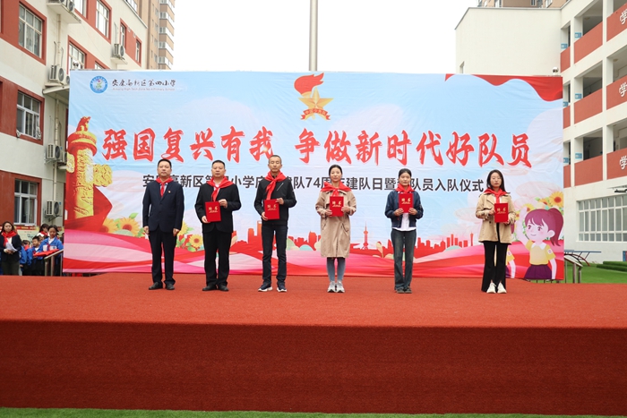 在激昂的音樂聲中,高年級的老隊(duì)員為新隊(duì)員佩戴紅領(lǐng)巾,新隊(duì)員們在隊(duì)旗下莊嚴(yán)宣誓,全體老隊(duì)員們重溫入隊(duì)誓詞。“我們是共產(chǎn)主義接班人,繼承革命先輩的光榮傳統(tǒng)……”全體少先隊(duì)員齊聲高唱《中國少年先鋒隊(duì)隊(duì)歌》,嘹亮的歌聲響徹校園上空。二六中隊(duì)的節(jié)目表演《逐夢小樹苗》,號召隊(duì)員們不負(fù)黨的期望,從小立志向、修品行、練本領(lǐng)、強(qiáng)體魄,向先進(jìn)榜樣學(xué)習(xí),快樂茁壯成長,努力成為德智體美勞全面發(fā)展的接班人。學(xué)校黨支部書記、少工委主任張平德學(xué)校黨支部書記、少工委主任張平德為新聘中隊(duì)輔導(dǎo)員頒發(fā)聘書,勉勵少先隊(duì)員珍惜時光、不負(fù)青春,勤學(xué)善思、心懷理想,用實(shí)際行動為紅領(lǐng)巾增光添彩。大隊(duì)輔導(dǎo)員李支珍帶領(lǐng)全體隊(duì)員呼號,錚錚誓言響徹耳畔,詮釋著堅定的信念。 “以詩雅正,勤學(xué)不綴,請黨放心,強(qiáng)國有我!”活動在全體同學(xué)高亢的口號聲中結(jié)束。全體少先隊(duì)員將以此次活動為新起點(diǎn),樹立遠(yuǎn)大理想,為紅領(lǐng)巾增添新時代的榮光。