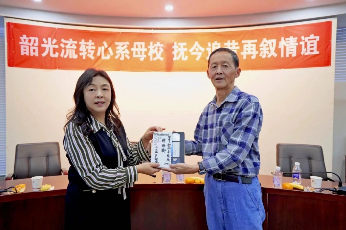 座談結(jié)束后,63級老校友嚴健華向母校贈送1993年四十周年校慶的珍貴影像資料,附中直屬黨支部書記衛(wèi)紅代表附中接受捐贈并對嚴健華表示感謝,附中的發(fā)展離不開所有校友的支持和幫助,未來一定繼續(xù)加強與校友間的聯(lián)系,共謀發(fā)展、共鑄輝煌!