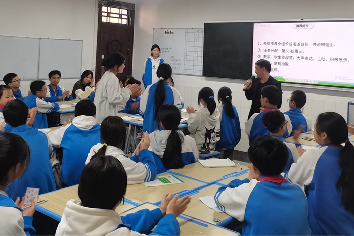抓實一個陣地強推進。本次課改聚焦“建構課堂新生態(tài)”這一主題,深耕課堂主陣地,注重轉變教學觀念、教學方式和評價方式,創(chuàng)新環(huán)境,搭建平臺,提高學生課堂參與率、培育自主學習意識與習慣。班級學生建立6人一組的“學伴共同體”,教師建立“研修共同體”,開展行動研究。實施由學校校長包抓、校務委員包班、教研組長包科、年級組長包級的“四包”責任制,保證課改工作網絡化、全方位的推進與實施。 精細一組培訓聚共識。學校先后對校委會班子、全校教師、七八年級各班小組長和各班學生進行小組合作經驗分享、小組建設現場觀摩、課改研討課、特色班建設評比等多維度課改培訓,不斷展示課堂新樣態(tài),不斷強化教師“以學生為主體,以學習為中心”的課改理念,為課改順利推行掃清障礙、鋪平道路。