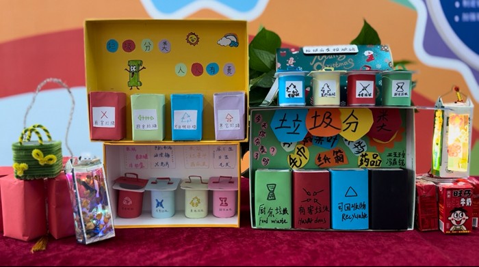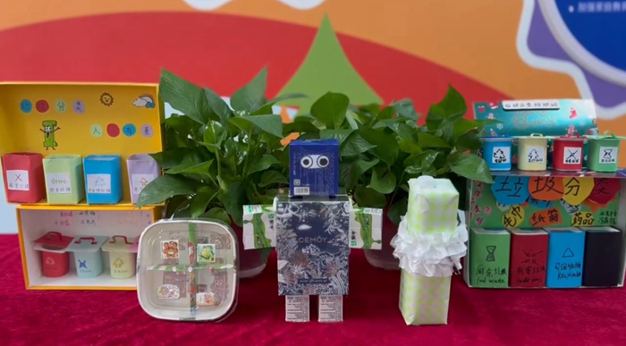 同學(xué)們以垃圾分類(lèi)為主題,結(jié)合自己日常生活中的觀(guān)察和學(xué)到的垃圾分類(lèi)知識(shí),認(rèn)真構(gòu)思,發(fā)揮想象力,用五彩斑斕的畫(huà)筆在紙上創(chuàng)作了屬于自己的環(huán)保理念繪畫(huà)作品。 孩子們利用廢舊塑料瓶、易拉罐、紙箱、廢舊衣物等常見(jiàn)生活廢品,充分發(fā)揮才智和創(chuàng)意,制作成各種各樣的生活用品或工藝品,體驗(yàn)變廢為寶的樂(lè)趣。