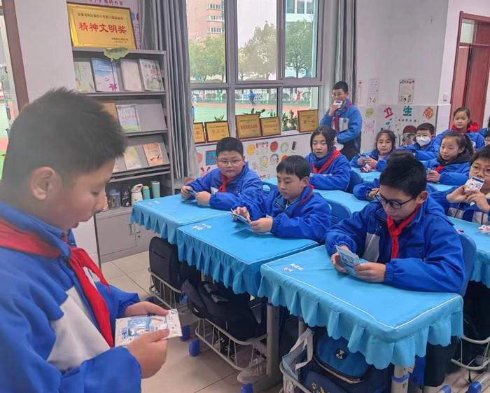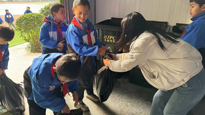 在校園垃圾放置區(qū),老師指導(dǎo)學(xué)生將收集的垃圾先按照可回收垃圾、有害垃圾、廚余垃圾、其他垃圾進(jìn)行分類(lèi),然后投放到相應(yīng)的垃圾桶內(nèi)。 同學(xué)們?cè)诶蠋煹氖痉、引?dǎo)下,將飲用完的牛奶盒按照“清洗、擠壓、晾干、投放指定位置“的方式進(jìn)行回收和整齊放置,以實(shí)際行動(dòng)倡導(dǎo)低碳生活,推進(jìn)垃圾分類(lèi)。