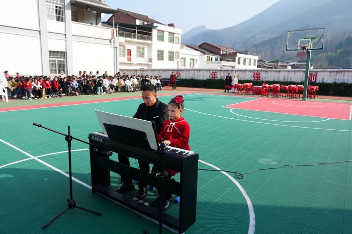 活動(dòng)伊始,龍獅翻飛跳躍,喜慶祥和的氛圍感染了在場(chǎng)觀眾。大合唱《明天會(huì)更好》,全體教師用優(yōu)美的的歌聲傳遞出對(duì)美好未來的無(wú)限憧憬。旗舞《中國(guó)范》,學(xué)生們手持彩旗,以青春洋溢的步伐展示著中國(guó)少年的風(fēng)采。男女對(duì)唱《紅軍渡·長(zhǎng)征源》深情演繹長(zhǎng)征精神,樂器獨(dú)奏展示了中國(guó)傳統(tǒng)音樂的魅力。師生鋼琴四手聯(lián)彈《歡樂進(jìn)行曲》為現(xiàn)場(chǎng)注入了一股活力,小品《如此課堂》以幽默詼諧的方式展現(xiàn)了學(xué)生的學(xué)習(xí)生活。古典舞《雨巷佳人》如夢(mèng)如幻,舞者用優(yōu)美的舞姿詮釋了雨巷中的詩(shī)意與溫情。鼓舞《祝福祖國(guó)三杯酒》以磅礴的氣勢(shì)表達(dá)了對(duì)祖國(guó)的祝福,將現(xiàn)場(chǎng)氛圍推向高潮。 最后,全體師生齊唱歌曲《萬(wàn)疆》,表達(dá)了對(duì)偉大祖國(guó)的無(wú)限敬愛。