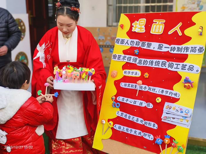 在活動(dòng)現(xiàn)場(chǎng),孩子們穿著喜慶的服裝,戴著可愛(ài)的頭飾,在各個(gè)廟會(huì)活動(dòng)中穿行、流連。十余個(gè)民俗活動(dòng)精彩紛呈,寫福字、捏面人、剪紙、造紙、投壺、老鷹抓小雞、打沙包、年味小吃……孩子們?cè)谟螒蛑懈惺苤袊?guó)傳統(tǒng)文化的魅力。