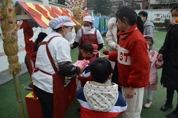 逛廟會(huì)游園活動(dòng)開(kāi)始啦!剪窗花,寫(xiě)福字、新年賀卡、捏泥人,家長(zhǎng)和孩子專心投入。投壺、丟沙包、蒙眼敲鑼等經(jīng)典傳統(tǒng)民間游戲,孩子們興趣滿滿。套圈游戲深受大家喜愛(ài),孩子們?cè)跀偽簧狭鬟B忘返。最后,家長(zhǎng)與幼兒憑7個(gè)打卡印章兌換一串糖葫蘆。 在歡快的音樂(lè)、甜蜜的美食以及趣味的游戲中,元旦廟會(huì)圓滿結(jié)束。孩子們?cè)诨顒?dòng)中體驗(yàn),在體驗(yàn)中成長(zhǎng),幼兒園全體教職工祝愿大家萬(wàn)事勝意、闔家幸福、龍年吉祥。