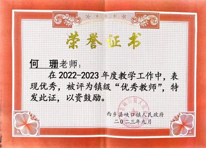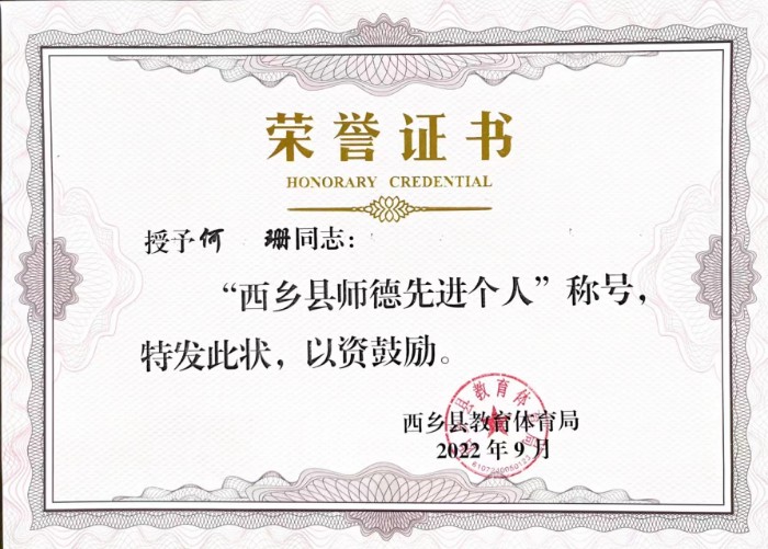 何珊于2015年從陜西學(xué)前師范學(xué)院學(xué)前教育專業(yè)畢業(yè),于2016年8月通過西鄉(xiāng)縣特崗教師招聘考試,2016年9月,工作于西鄉(xiāng)縣峽口鎮(zhèn)左溪小學(xué),擔(dān)任語文、數(shù)學(xué)、英語教學(xué)工作,教育扶貧工作,并擔(dān)任教導(dǎo)主任一職。2019年9月至今,工作于西鄉(xiāng)縣峽口鎮(zhèn)中心幼兒園,擔(dān)任副園長(zhǎng)一職,目前已從事教育教學(xué)工作7年。她的成長(zhǎng)與家庭先后三代人投身教育一線是密不可分的,教學(xué)工作中,她不斷提高個(gè)人理論素質(zhì)和思想修養(yǎng),恪守教師職業(yè)道德,嚴(yán)格遵守相關(guān)制度,認(rèn)真鉆研教材、教法,精心備課、上課、批改作業(yè),耐心輔導(dǎo),做到了用真情感動(dòng)人、用行為影響人、用知識(shí)武裝人、用品德塑造人。在峽口鎮(zhèn)中心幼兒園工作期間,她以德為先,做教書育人的示范者,堅(jiān)持深入教學(xué)第一線,堅(jiān)持看課、評(píng)課、議課,積極參加教學(xué)研討活動(dòng);勇于實(shí)踐,做課程改革的探索者,帶領(lǐng)全園教師開發(fā)園本課程《雙色文化潤(rùn)童年》,因材施教;堅(jiān)持勤儉治園,做廉潔自律的覺悟者,講黨性,嚴(yán)于己,寬于人,正確對(duì)待不同意見,團(tuán)結(jié)教職工,盡心盡責(zé)做好一切工作。