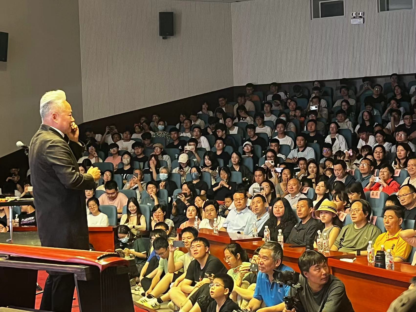 當(dāng)晚,音樂會還未開始時,只能容納400人的報告廳,早早地擠滿了聞訊而來的師生。他們都想一睹這位曾在B站跨年晚會上一人大戰(zhàn)百人樂團,精通多種樂器的“音樂頑童”的風(fēng)采。 音樂會開始,由人文學(xué)院黨委書記紀夢然介紹:“今年是人文學(xué)院建院三十周年,本次國樂聆享會也是院慶系列活動之一。方錦龍是享有盛譽的國樂藝術(shù)家、樂器收藏家、當(dāng)代五弦琵琶代表人物,‘芳華十八’時尚國樂團創(chuàng)始人。從藝40余年來,他出訪逾五十個國家,以多元、創(chuàng)新方式展現(xiàn)傳統(tǒng)音樂的魅力。作為傳統(tǒng)民樂文化的網(wǎng)絡(luò)破圈者,他為電腦游戲配樂、和虛擬偶像同臺、電聲說唱混搭宮商角徵羽。在他的演繹下,傳統(tǒng)國樂不再“曲高和寡”,而是與搖滾、電子音樂等現(xiàn)代元素“碰撞”交流,在多個社交網(wǎng)站受到年輕人追捧!