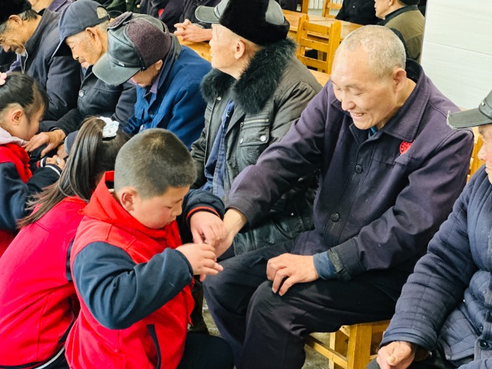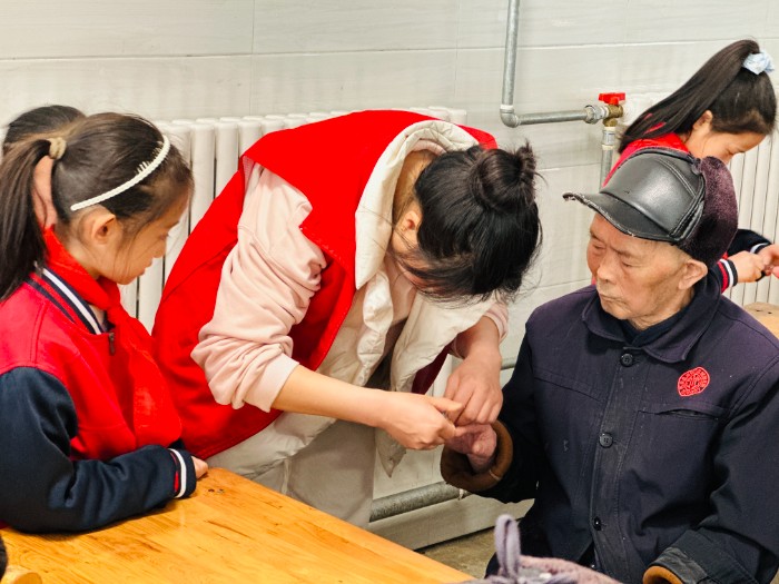 于是少先隊(duì)員一到敬老院就迅速行動(dòng)起來(lái),有的拿起掃帚掃地,有的拿起抹布擦桌子,還有的幫助老人整理房間。他們認(rèn)真細(xì)致地打掃著每一個(gè)角落,確保敬老院的環(huán)境整潔干凈。二是為老年人獻(xiàn)上精彩的《你笑起來(lái)真好看》《中華孝道》節(jié)目表演,贏得爺爺奶奶們陣陣掌聲。三是支教教師郭崇利示范《拍拍操》,帶領(lǐng)少先隊(duì)員和老年人進(jìn)行精彩的互動(dòng),熱烈的氛圍讓每個(gè)人臉上洋溢著幸福的笑容。四是少先隊(duì)員和帶隊(duì)老師一起為爺爺奶奶剪指甲,用實(shí)際行動(dòng)表達(dá)對(duì)老年人的尊敬和愛(ài)意。五是學(xué)校黨支部書記、校長(zhǎng)張衍個(gè)人為敬老院現(xiàn)場(chǎng)捐款1000元,用于改善老年人的生活物質(zhì)條件。