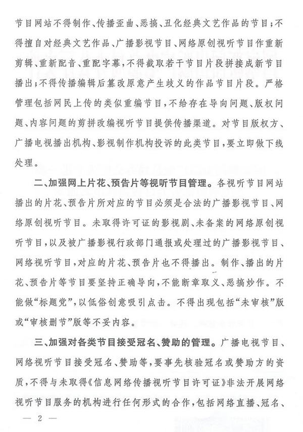 廣電總局下發(fā)特急文件:堅(jiān)決禁止非法抓取、剪拼改編視聽(tīng)節(jié)目今天,國(guó)家新聞出版廣電總局下發(fā)特急文件,進(jìn)一步規(guī)范網(wǎng)絡(luò)視聽(tīng)節(jié)目傳播秩序。通知指出:近期一些網(wǎng)絡(luò)視聽(tīng)節(jié)目制作、播出不規(guī)范的問(wèn)題十分突出,產(chǎn)生了極壞的社會(huì)影響。還有一些節(jié)目以非法網(wǎng)絡(luò)視聽(tīng)平臺(tái)及相關(guān)非法視聽(tīng)產(chǎn)品作為冠名,為非法視聽(tīng)內(nèi)容在網(wǎng)上流傳提供了渠道。為進(jìn)一步規(guī)范網(wǎng)絡(luò)視聽(tīng)節(jié)目的傳播秩序,國(guó)家新聞出版廣電總局做出四點(diǎn)要求: 一、堅(jiān)決禁止非法抓取、剪拼改編視聽(tīng)節(jié)目的行為。 二、加強(qiáng)網(wǎng)上片花、預(yù)告片等視聽(tīng)節(jié)目管理。 三、加強(qiáng)對(duì)各類(lèi)節(jié)目接受冠名、贊助的管理。 四、嚴(yán)格落實(shí)屬地管理責(zé)任。 通知原文如下: