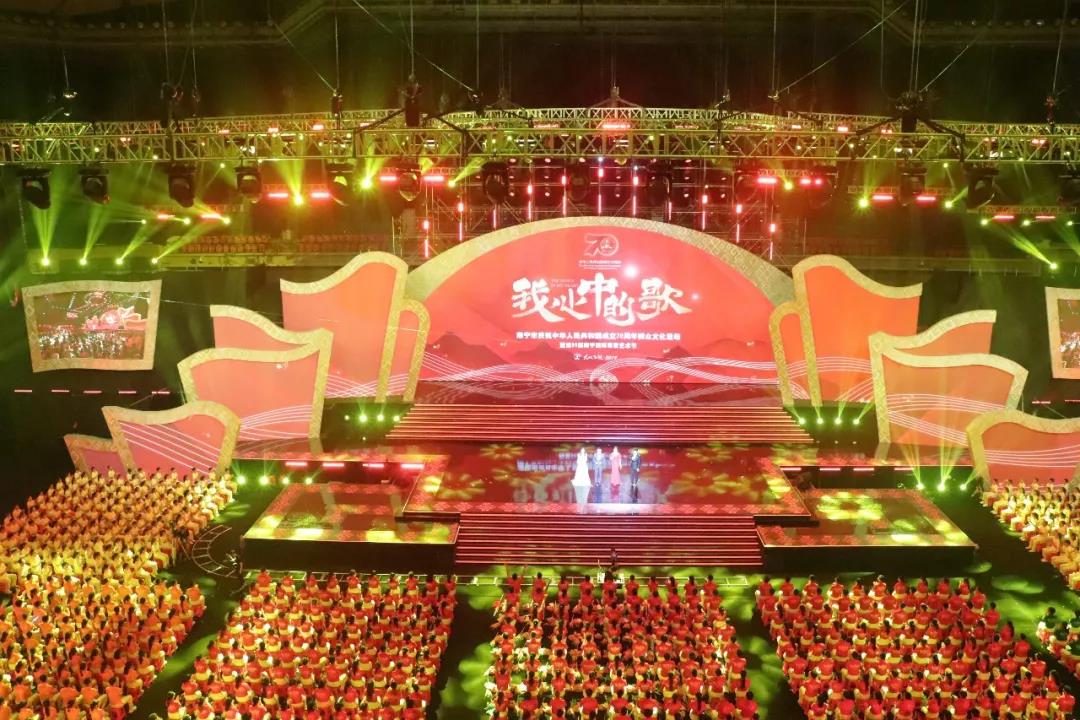 ▲南寧市慶祝中華人民共和國成立70周年群眾文化活動暨第21屆南寧國際民歌藝術節(jié)“大地飛歌•2019”現(xiàn)場 當晚,現(xiàn)場成為“歌聲的海洋”。今年創(chuàng)新設計了序篇“歌聲嘹亮”,中共南寧市直屬機關工委、中共南寧市委教育工委、南寧市國資委,南寧市各縣(區(qū))、開發(fā)區(qū)共18支拉歌方陣隊1260名隊員齊唱《聽媽媽講那過去的故事》《萬泉河水清又清》《保衛(wèi)黃河》《中國人民解放軍軍歌》《歌唱祖國》《英雄贊歌》《長江之歌》《在希望的田野上》《愛我中華》《時代號子》《今天是你的生日》等慶祝中華人民共和國成立70周年優(yōu)秀歌曲。感染力強、聲勢浩大的臺上臺下互動性拉歌,點燃全場熱烈氛圍。