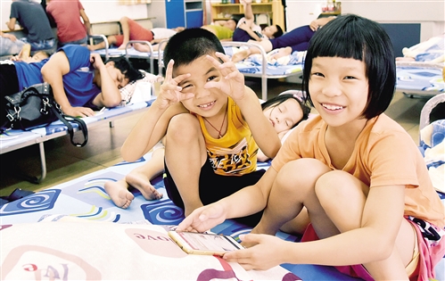 9月16日,在廣東陽江東平鎮(zhèn)中心小學(xué)臨時安置點,當?shù)乇晦D(zhuǎn)移的小朋友在玩耍。 新華社記者周科攝