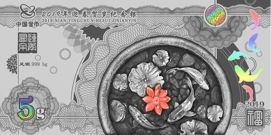 2019年迎春賀歲紀(jì)念金卡背面 金銀卡正面圖案均為王羲之手書(shū)“福”字,內(nèi)包含五福,分別刊“2019年迎春賀歲紀(jì)念金”“2019年迎春賀歲紀(jì)念銀”的中文字樣及漢語(yǔ)拼音、“2019年”“五福臨門(mén)”“己亥年”、中國(guó)金幣標(biāo)志、重量及編號(hào)。背面圖案均以一缸荷花和錦鯉為主圖,并分別刊“2019年迎春賀歲紀(jì)念金”“2019年迎春賀歲紀(jì)念銀”的中文字樣及漢語(yǔ)拼音、“連年有余”、中國(guó)金幣標(biāo)志、重量及成色。
