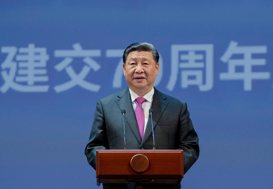 “我們不會忘記,在艱苦卓絕的衛(wèi)國戰(zhàn)爭和抗日戰(zhàn)爭期間,中蘇軍民并肩作戰(zhàn)、共同抗擊法西斯侵略,用鮮血鑄就了牢不可破的戰(zhàn)斗情誼!贝髣≡簝(nèi),中俄建交70周年紀念大會現(xiàn)場響起習(xí)近平鏗鏘有力的聲音。 中俄始終踐行“世代友好、永不為敵”的理念。70年來,兩國關(guān)系風(fēng)雨兼程、砥礪前行,如今已發(fā)展成為互信程度最高、協(xié)作水平最高、戰(zhàn)略價值最高的一對大國關(guān)系。 到訪的第一天,中俄兩國元首就決定將兩國關(guān)系提升為“中俄新時代全面戰(zhàn)略協(xié)作伙伴關(guān)系”,這是中國對外雙邊關(guān)系中首次出現(xiàn)“新時代全面戰(zhàn)略協(xié)作伙伴關(guān)系”的新表述、新定位,意味著兩國將雙邊關(guān)系定位提升到前所未有的新高度。 70年是里程碑,也是新起點。習(xí)近平為新時代中俄關(guān)系擘畫未來:“互信為基石”“深化利益交融”“促進民心相通”“擔當有為”。他強調(diào),“無論過去、現(xiàn)在還是將來,中俄都是搬不走的好鄰居、拆不散的真伙伴!薄拔覀冇行判摹⒂心芰υ谶^去70年經(jīng)驗成果基礎(chǔ)上,推動中俄關(guān)系進入更高水平、更大發(fā)展的新時代! 構(gòu)建互利合作新格局