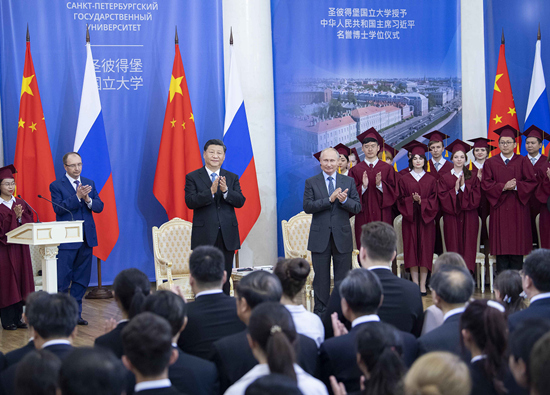 當?shù)貢r間6月6日,又一場特殊儀式在圣彼得堡國立大學(xué)舉行。習(xí)近平被授予圣彼得堡國立大學(xué)名譽博士學(xué)位。他在答辭中說道,這既是雙方教育和人文領(lǐng)域密切交流的例證,更是中俄關(guān)系高水平的重要體現(xiàn)。他同時希望雙方不斷擴大教育領(lǐng)域交流合作。 近年來,中俄兩國文化教育合作不斷深化。兩國聯(lián)合設(shè)計建造的圣彼得堡國立547中學(xué)成為當?shù)氐拿餍菍W(xué)校,被稱為“波羅的海畔的美麗明珠”。校長安娜·瑪拉婭介紹說,學(xué)校非常重視中文和中國文化教育。未來,學(xué)生也更有希望考上中國的大學(xué)。 在俄羅斯,學(xué)習(xí)漢語成為潮流,甚至列入“高考”科目。當?shù)亻_設(shè)漢語語言文學(xué)專業(yè)的高校從上世紀90年代初的七八所增加到現(xiàn)在的60多所。 春秋賡續(xù),兩國元首親力推動,戰(zhàn)略性大項目紛紛落地,傳統(tǒng)領(lǐng)域和新興領(lǐng)域合作齊頭并進。 截至2018年年底,中俄雙邊貿(mào)易額突破1000億美元,同比增長27.1%,增速在中國前十大貿(mào)易伙伴中位列第一。2019年,兩國在能源、交通、農(nóng)業(yè)、航空航天等領(lǐng)域重大合作項目穩(wěn)步實施,黑河公路橋、同江鐵路橋成功合龍,中俄東線天然氣管道將于年內(nèi)通氣,衛(wèi)星導(dǎo)航系統(tǒng)合作成果顯著。 下一步,中俄雙邊貿(mào)易額將向2000億美元邁進,雙方將深入挖掘新興領(lǐng)域合作潛力,各地方加強交流互鑒,實實在在造福兩國人民。 為構(gòu)建人類命運共同體作出新貢獻 普京曾說:“俄羅斯需要一個繁榮穩(wěn)定的中國,中國也需要一個強大成功的俄羅斯”;習(xí)近平則在6年前莫斯科國際關(guān)系學(xué)院的演講中回應(yīng):中俄共同發(fā)展“將為國際秩序和國際體系朝著公正合理的方向發(fā)展提供正能量”。 在兩國元首引領(lǐng)下,中俄關(guān)系已成為世界上最重要的一組雙邊關(guān)系,更是最好的一組大國關(guān)系。這不僅事關(guān)兩國人民福祉,也關(guān)乎世界的和平、穩(wěn)定、繁榮。 面對世界百年未有之大變局,人類社會期待大國方案,更期待大國擔當。習(xí)近平在此訪中指出,在國際事務(wù)中要貢獻更多“中俄方案”。