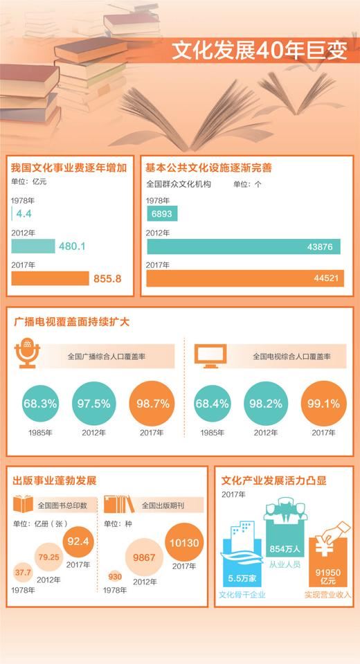 數(shù)據(jù)來源:國家統(tǒng)計(jì)局 制圖:沈亦伶 “改革開放初期,那時(shí)候經(jīng)常是多人共看一本書,電視里也只有很少的幾部電視劇,文化生活可以說比較貧乏。”家住北京市朝陽區(qū)的李東陽出生于20世紀(jì)60年代初期,他深切感受到了改革開放40年以來文化生活發(fā)生的巨大變化,“現(xiàn)在的文化生活多豐富啊,圖書、報(bào)刊、電影、電視、網(wǎng)絡(luò)文化等目不暇接。為咱新時(shí)代點(diǎn)贊!” 改革開放40年來,各地區(qū)各部門堅(jiān)持社會(huì)主義先進(jìn)文化前進(jìn)方向,深化文化體制改革,建立健全現(xiàn)代文化市場體系,構(gòu)建完善公共文化服務(wù)體系,文化事業(yè)普惠民生,文化產(chǎn)業(yè)快速發(fā)展,文化強(qiáng)國建設(shè)穩(wěn)步推進(jìn)。特別是黨的十八大以來,社會(huì)主義核心價(jià)值觀建設(shè)扎實(shí)推進(jìn),文化創(chuàng)新創(chuàng)造活力被進(jìn)一步激發(fā),文化事業(yè)、文化產(chǎn)業(yè)蓬勃發(fā)展,人民群眾的文化獲得感和幸福感顯著增強(qiáng)。2017年,全年全國文化事業(yè)費(fèi)855.8億元,比上年增長11.0%,黨的十八大以來,全國文化事業(yè)費(fèi)增速每年都超過10.0%。 40年來,廣大群眾深切感受到,身邊的公共圖書館、文化館、博物館等公共文化設(shè)施的服務(wù)越來越豐富、越來越對味。尤其是黨的十八大以來,標(biāo)準(zhǔn)化、均等化的現(xiàn)代公共文化服務(wù)體系日益完善,服務(wù)效能顯著提升。目前,全國“三館一站”公共文化服務(wù)設(shè)施全部免費(fèi)開放,基本實(shí)現(xiàn)了“縣有公共圖書館、文化館,鄉(xiāng)有綜合文化站”的建設(shè)目標(biāo);廣播電視村村通、文化信息資源共享、農(nóng)家書屋等重大文化惠民工程深入實(shí)施,公共文化服務(wù)能力和普惠水平不斷提高。 40年來,文化消費(fèi)需求質(zhì)量不斷提高、數(shù)量不斷增加。與此同時(shí),我國文化市場主體、經(jīng)營方式日趨多元,文化產(chǎn)業(yè)規(guī)模不斷擴(kuò)大。特別是黨的十八大以來,文化與互聯(lián)網(wǎng)、高科技融合發(fā)展,傳統(tǒng)文化企業(yè)轉(zhuǎn)型升級,質(zhì)量和效益穩(wěn)步提升。數(shù)據(jù)顯示,2017年,全國共有文化骨干企業(yè)5.5萬家,比2012年增長51.3%;從業(yè)人員為854萬人,比2012年增長22.2%;實(shí)現(xiàn)營業(yè)收入91950億元,比2012年增長63.4%。文化產(chǎn)業(yè)發(fā)展活力凸顯,不僅滿足了人們多樣化的精神文化需求,更成為當(dāng)前經(jīng)濟(jì)增長亮點(diǎn)之一,在推動(dòng)經(jīng)濟(jì)發(fā)展、優(yōu)化產(chǎn)業(yè)結(jié)構(gòu)中發(fā)揮了重要作用。 伴隨著改革開放的步伐,我國文化產(chǎn)品進(jìn)出口連續(xù)多年保持順差,與“一帶一路”沿線國家的文化貿(mào)易取得積極進(jìn)展,文化交流、文化貿(mào)易和文化投資并舉的“文化走出去”新格局逐漸形成,中華文化影響力日益增強(qiáng),國家文化軟實(shí)力得到提升。黨的十八大以來,中俄、中美、中歐、中阿、中非等文化交流合作機(jī)制向更高層次發(fā)展。“歡樂春節(jié)”等文化品牌活動(dòng)影響遍及全球,樹立了中國的形象和文化符號。中國文化年(節(jié))等活動(dòng)天天有、月月有、年年有,成為促進(jìn)政府間文化交流與合作的常態(tài)化機(jī)制。 黨的十九大報(bào)告指出,“沒有高度的文化自信,沒有文化的繁榮興盛,就沒有中華民族偉大復(fù)興。要堅(jiān)持中國特色社會(huì)主義文化發(fā)展道路,激發(fā)全民族文化創(chuàng)新創(chuàng)造活力,建設(shè)社會(huì)主義文化強(qiáng)國。”宣傳思想系統(tǒng)工作者正以習(xí)近平新時(shí)代中國特色社會(huì)主義思想和黨的十九大精神為指導(dǎo),增強(qiáng)“四個(gè)意識(shí)”、堅(jiān)定“四個(gè)自信”,自覺承擔(dān)起舉旗幟、聚民心、育新人、興文化、展形象的使命任務(wù)。(鄭海鷗) 編輯:文平 |