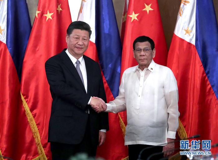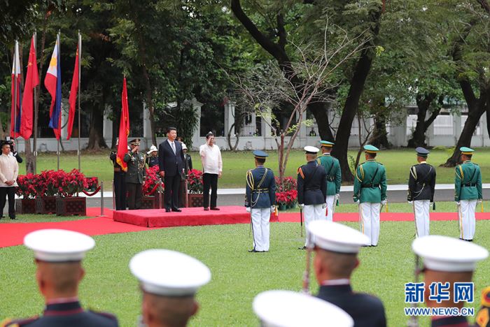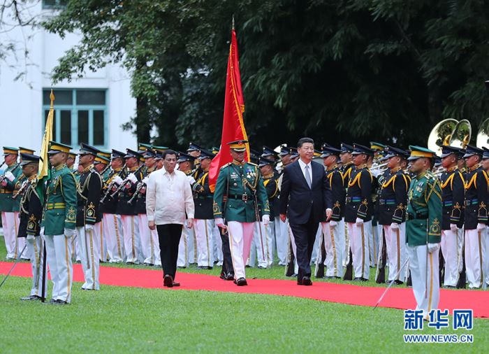 11月20日,國(guó)家主席習(xí)近平在馬尼拉同菲律賓總統(tǒng)杜特爾特舉行會(huì)談。會(huì)談開(kāi)始前,習(xí)近平出席杜特爾特在總統(tǒng)府前草坪舉行的隆重歡迎儀式。這是習(xí)近平在杜特爾特陪同下沿紅地毯檢閱儀仗隊(duì)。 新華社記者 鞠鵬 攝 會(huì)談后,兩國(guó)元首共同見(jiàn)證了《中華人民共和國(guó)政府與菲律賓共和國(guó)政府關(guān)于共同推進(jìn)“一帶一路”建設(shè)的諒解備忘錄》、《中華人民共和國(guó)政府與菲律賓共和國(guó)政府關(guān)于油氣開(kāi)發(fā)合作的諒解備忘錄》等多項(xiàng)雙邊合作文件的簽署。 兩國(guó)元首共同會(huì)見(jiàn)了記者。 會(huì)談開(kāi)始前,習(xí)近平出席杜特爾特在總統(tǒng)府前草坪舉行的隆重歡迎儀式。