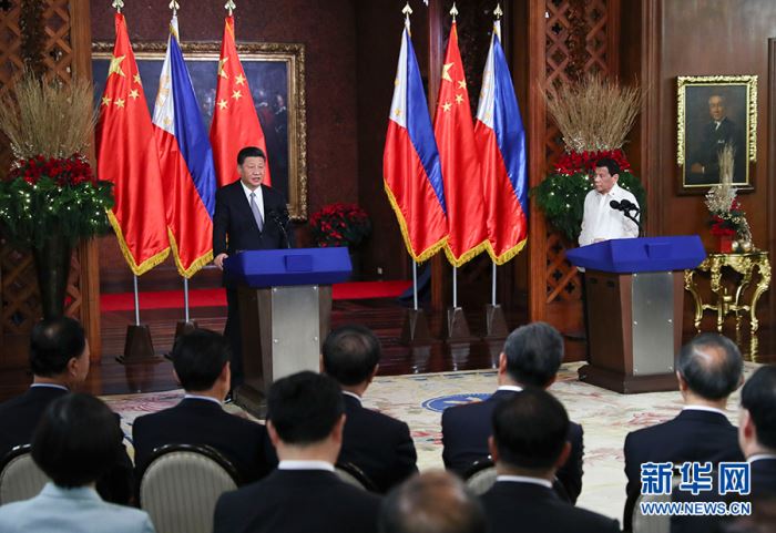 11月20日,國(guó)家主席習(xí)近平在馬尼拉同菲律賓總統(tǒng)杜特爾特舉行會(huì)談。 新華社記者 謝環(huán)馳 攝 習(xí)近平強(qiáng)調(diào),雙方?jīng)Q定建立中菲全面戰(zhàn)略合作關(guān)系,符合兩國(guó)民眾期待,適應(yīng)雙邊關(guān)系發(fā)展要求。雙方要加強(qiáng)兩國(guó)元首對(duì)雙邊關(guān)系的戰(zhàn)略引領(lǐng),推動(dòng)各層級(jí)往來(lái),增強(qiáng)戰(zhàn)略互信。中方支持菲律賓走適合本國(guó)國(guó)情的發(fā)展道路。雙方要把安全、發(fā)展、人文三大支柱領(lǐng)域合作扎扎實(shí)實(shí)推向深入。中方堅(jiān)定支持菲律賓禁毒和反恐事業(yè),將繼續(xù)在力所能及范圍內(nèi)向菲律賓提供支持,幫助菲律賓開(kāi)展更多減貧等社會(huì)民生項(xiàng)目,擴(kuò)大教育、文化、旅游等交流合作,打造增進(jìn)兩國(guó)人民了解和友誼的新舞臺(tái)。菲律賓是中國(guó)共建“一帶一路”的重要伙伴。雙方要深化“一帶一路”倡議同菲律賓發(fā)展戰(zhàn)略對(duì)接,加強(qiáng)基礎(chǔ)設(shè)施建設(shè)、電信、農(nóng)業(yè)等領(lǐng)域合作。 習(xí)近平指出,中菲在南海有廣泛共同利益,可以繼續(xù)通過(guò)友好協(xié)商管控分歧,推進(jìn)海上務(wù)實(shí)合作,為地區(qū)和平穩(wěn)定和人民福祉作出應(yīng)有貢獻(xiàn)。中方支持菲律賓履行中國(guó)-東盟關(guān)系協(xié)調(diào)國(guó)和中國(guó)-東盟東部增長(zhǎng)區(qū)合作協(xié)調(diào)國(guó)職責(zé),愿同菲方攜手推動(dòng)中國(guó)-東盟關(guān)系優(yōu)化升級(jí),推動(dòng)?xùn)|亞合作得到更大發(fā)展。中菲同為亞洲新興市場(chǎng)經(jīng)濟(jì)體,要加強(qiáng)在地區(qū)和國(guó)際事務(wù)中協(xié)調(diào)合作。