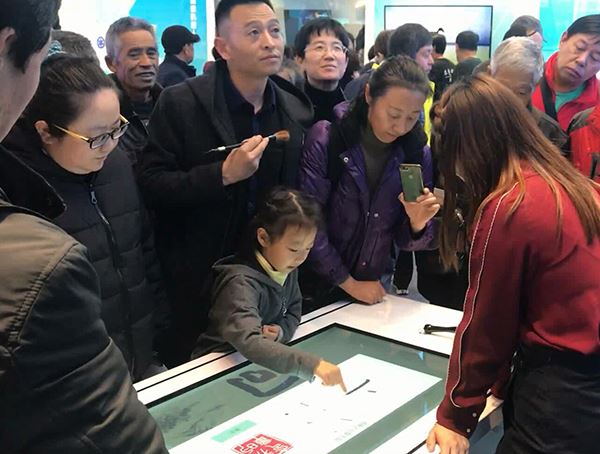 這個(gè)書(shū)法臺(tái)上沒(méi)有墨水 只用干毛筆、手指即可書(shū)寫(xiě) 字跡可同步投射在顯示屏上 還可保存后掃描二維碼分享↓↓↓