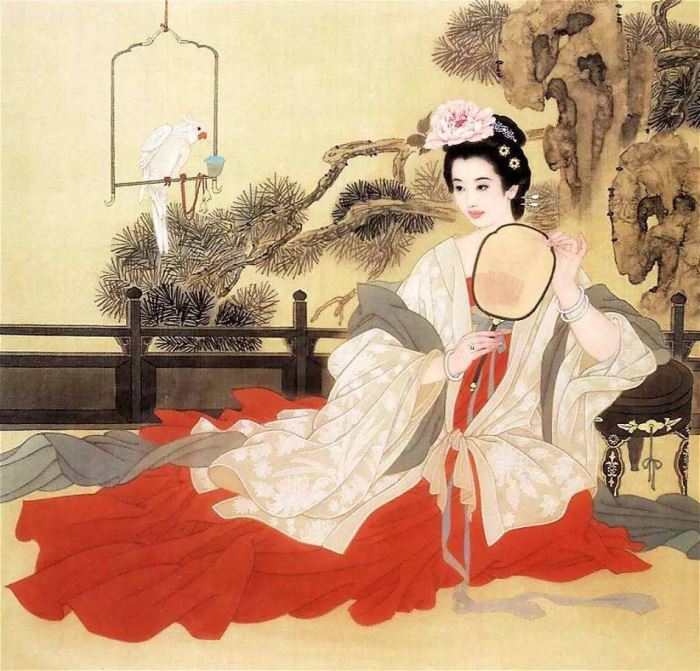 王昌齡《長(zhǎng)信愁》詩(shī):“奉帚平明秋殿開,且將團(tuán)扇共徘徊”!墩壬刃落洝份d:近世通用素絹,兩面繃之,或泥金、瓷青、湖色,有月圓、腰圓、六角諸式,皆倩名人書畫,柄用梅烙、湘妃、棕竹,亦有洋漆、象牙之類。名為“團(tuán)扇”。圓形或近似圓形扇面,扇柄不長(zhǎng)。 宋以前,上流社會(huì)流行以絲綢和紙作扇面的團(tuán)扇,素白朦朧的圓形扇面,通過細(xì)膩的刺繡或繪畫手法加以點(diǎn)綴,顯得別具風(fēng)情,博得了才子佳人的喜愛。用漏地紗做的扇面,可以隔扇窺人,叫作“瞧郎扇”,至于扇子的用途,大家顧名思義就能理解,青年君就不過多解釋了~ 團(tuán)扇往往與美人同時(shí)出現(xiàn)。那一幅幅仕女圖中,體態(tài)豐腴、衣著華美的仕女們,或談笑,或靜立,或賞花鳥魚蟲,手中必少不得那一團(tuán)薄霧輕云般的扇。或執(zhí)扇輕搖,或以扇遮面,無(wú)一不體現(xiàn)了仕女的溫雅不俗。