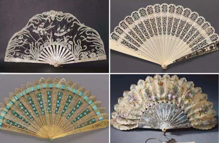 在歐洲人手里,折扇開始“穿金戴銀”,他們用黃金、象牙、龜甲、珠母等來(lái)做扇骨,而扇面則用蕾絲、綢緞、花邊和羽毛、獸皮制成,上面往往還裝飾有珍貴的金屬和寶石。